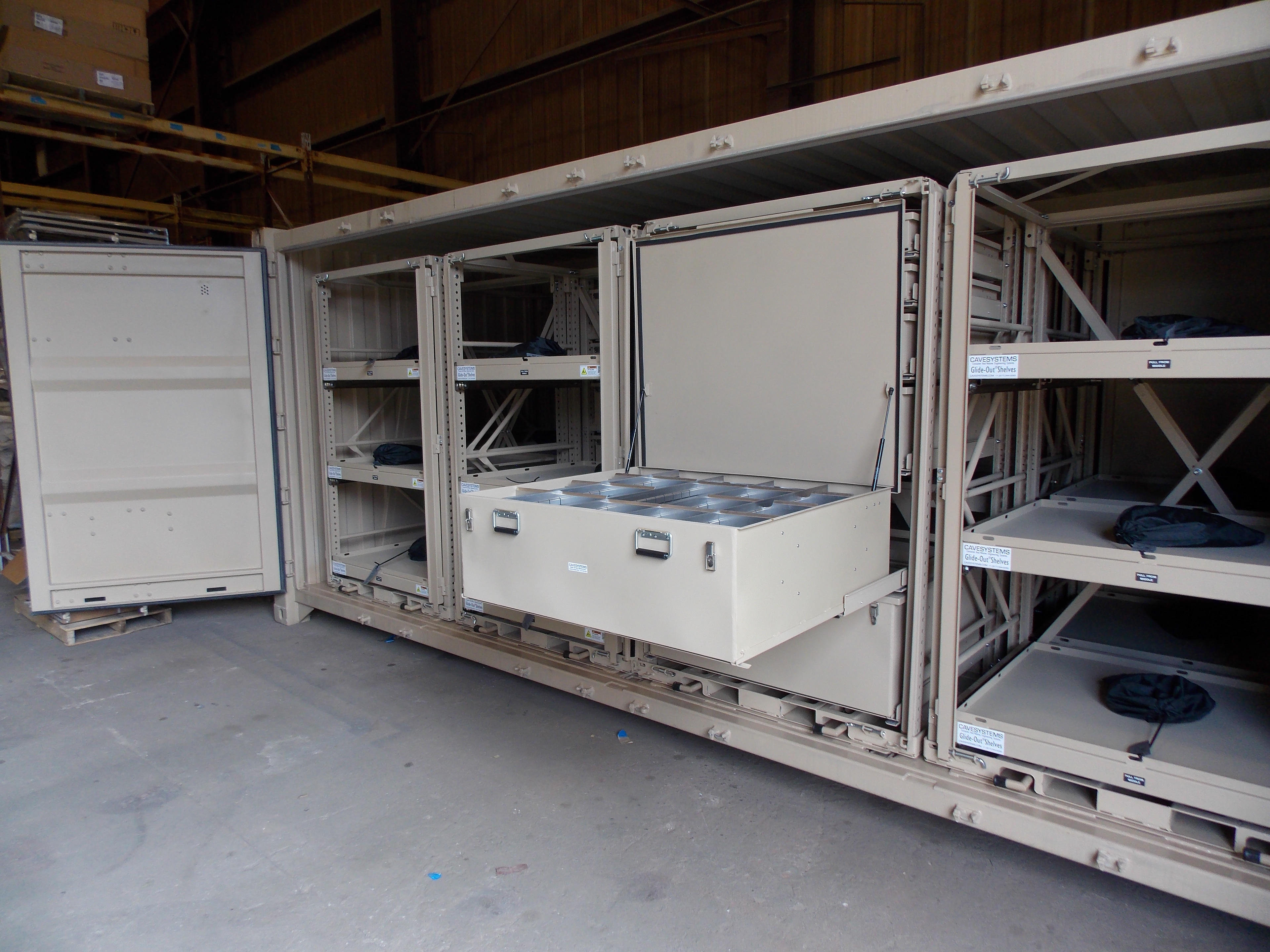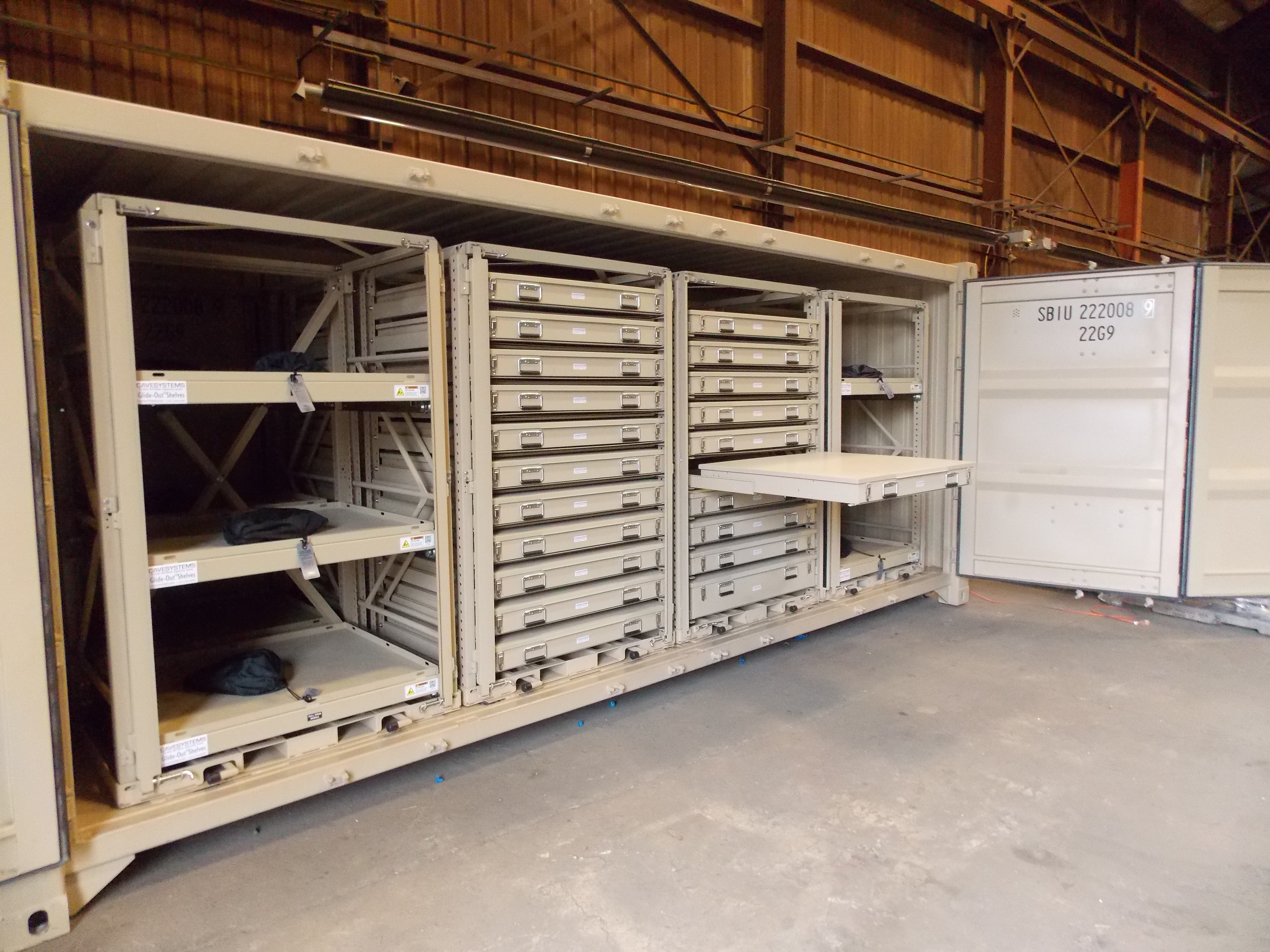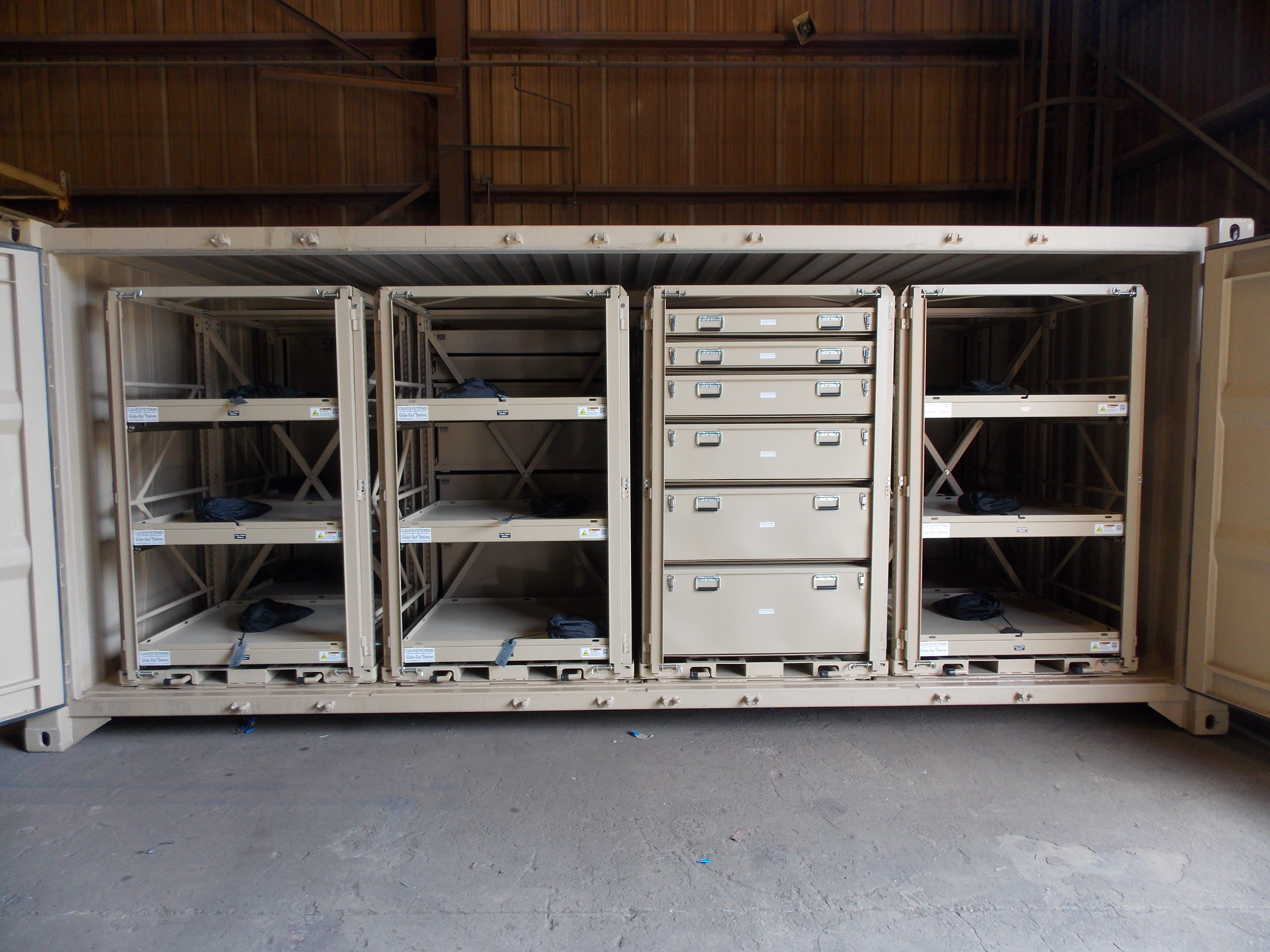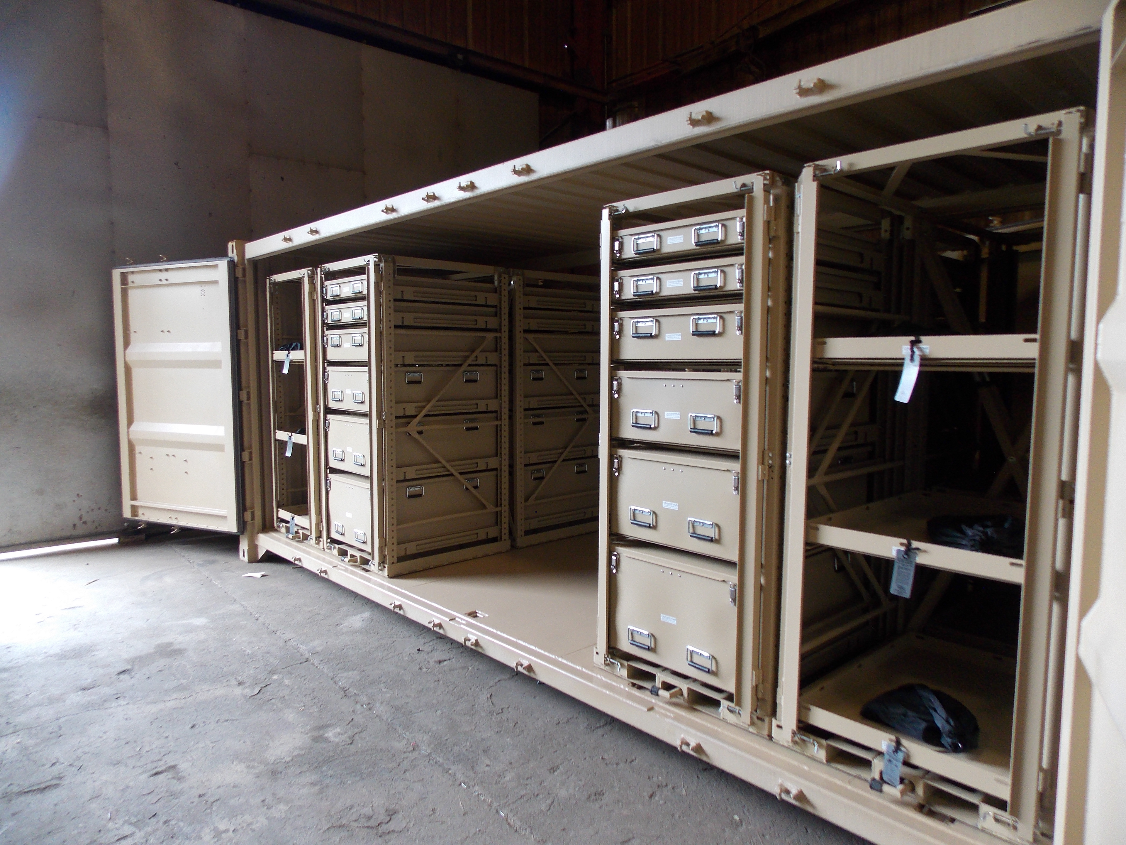 The largest container we outfit with doors on both sides. Ideal for both In Garrison or Deployment with the option for PLS/LHS compatible A-Frame and rails.