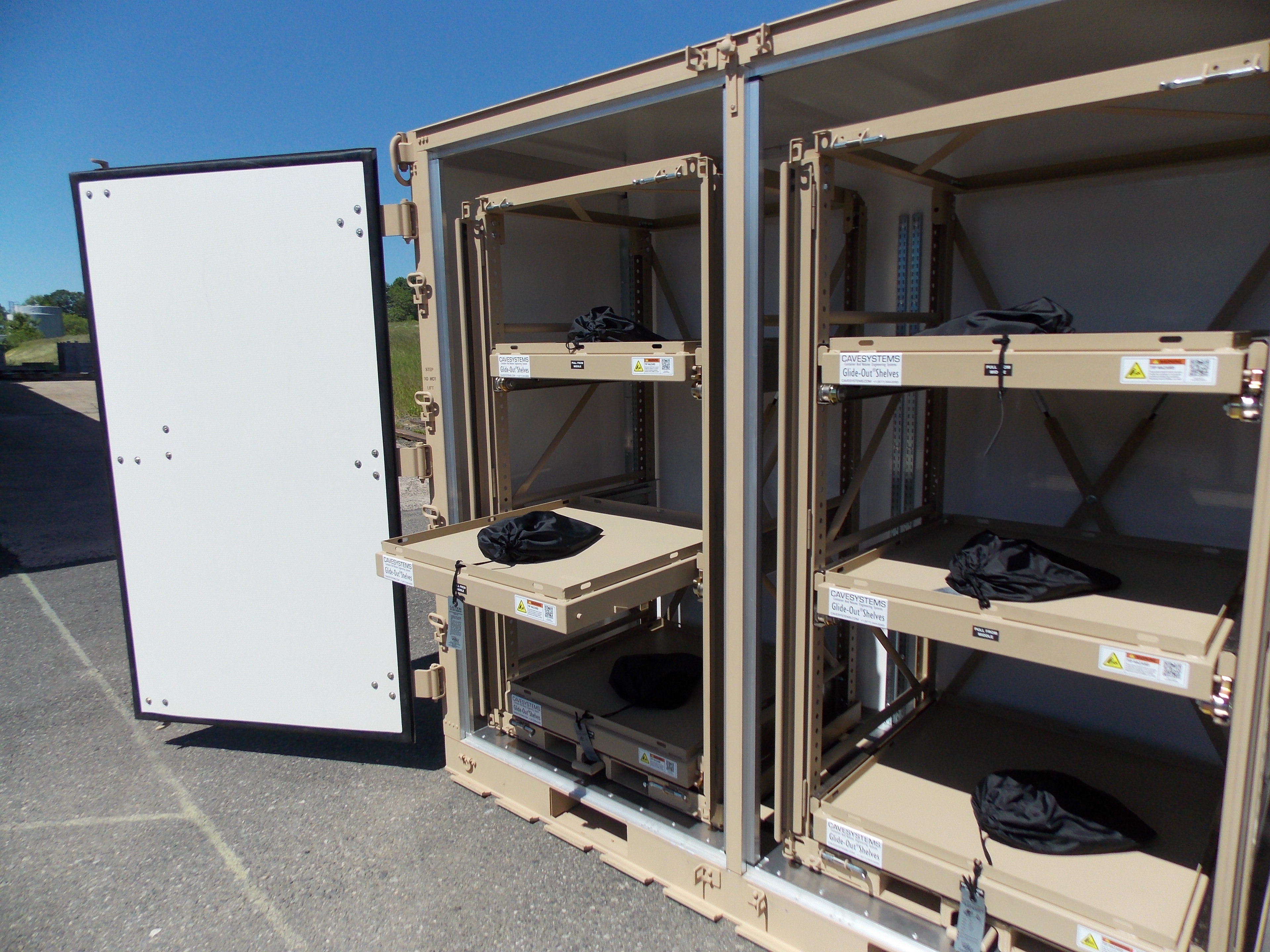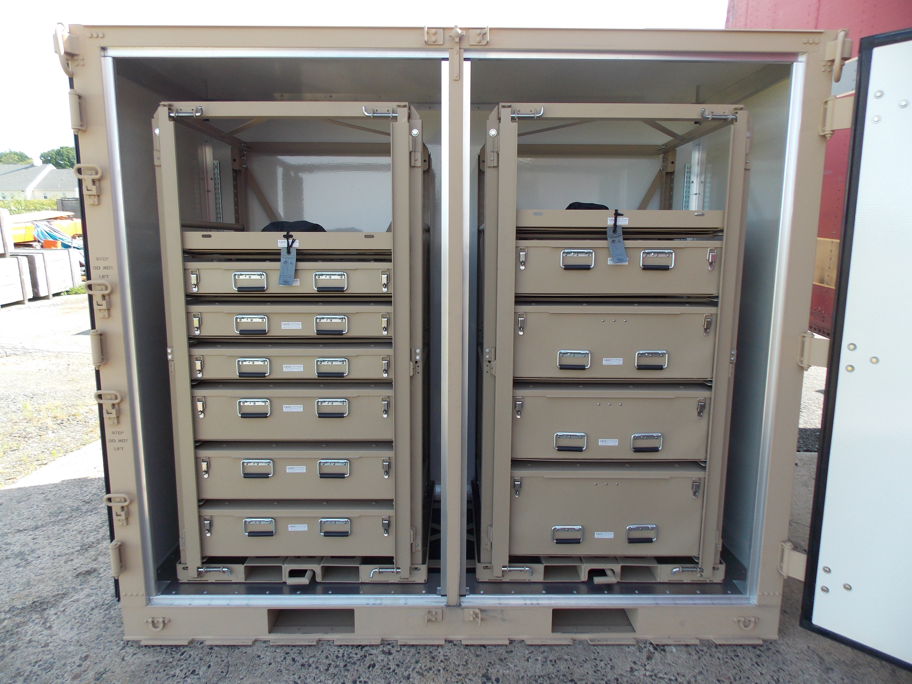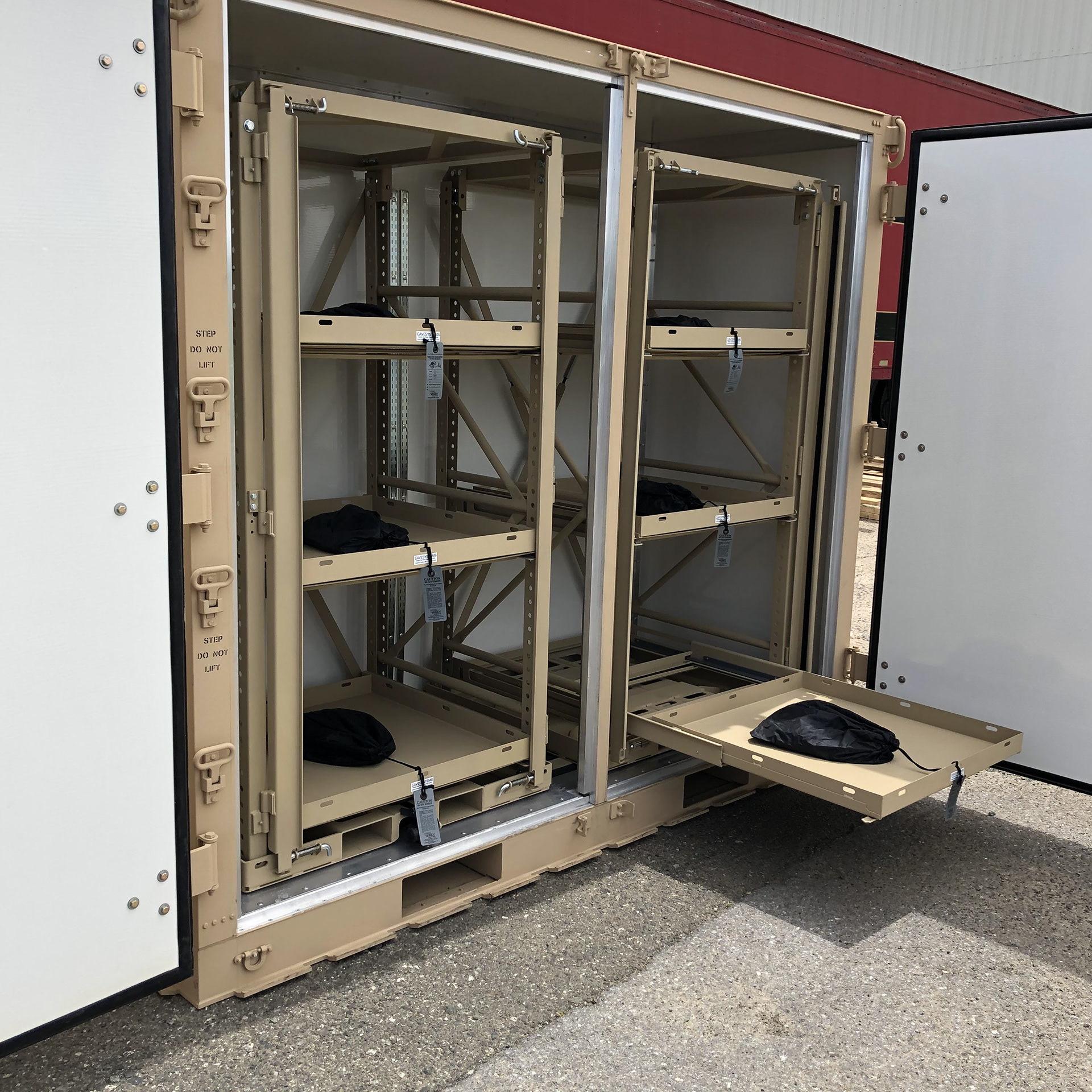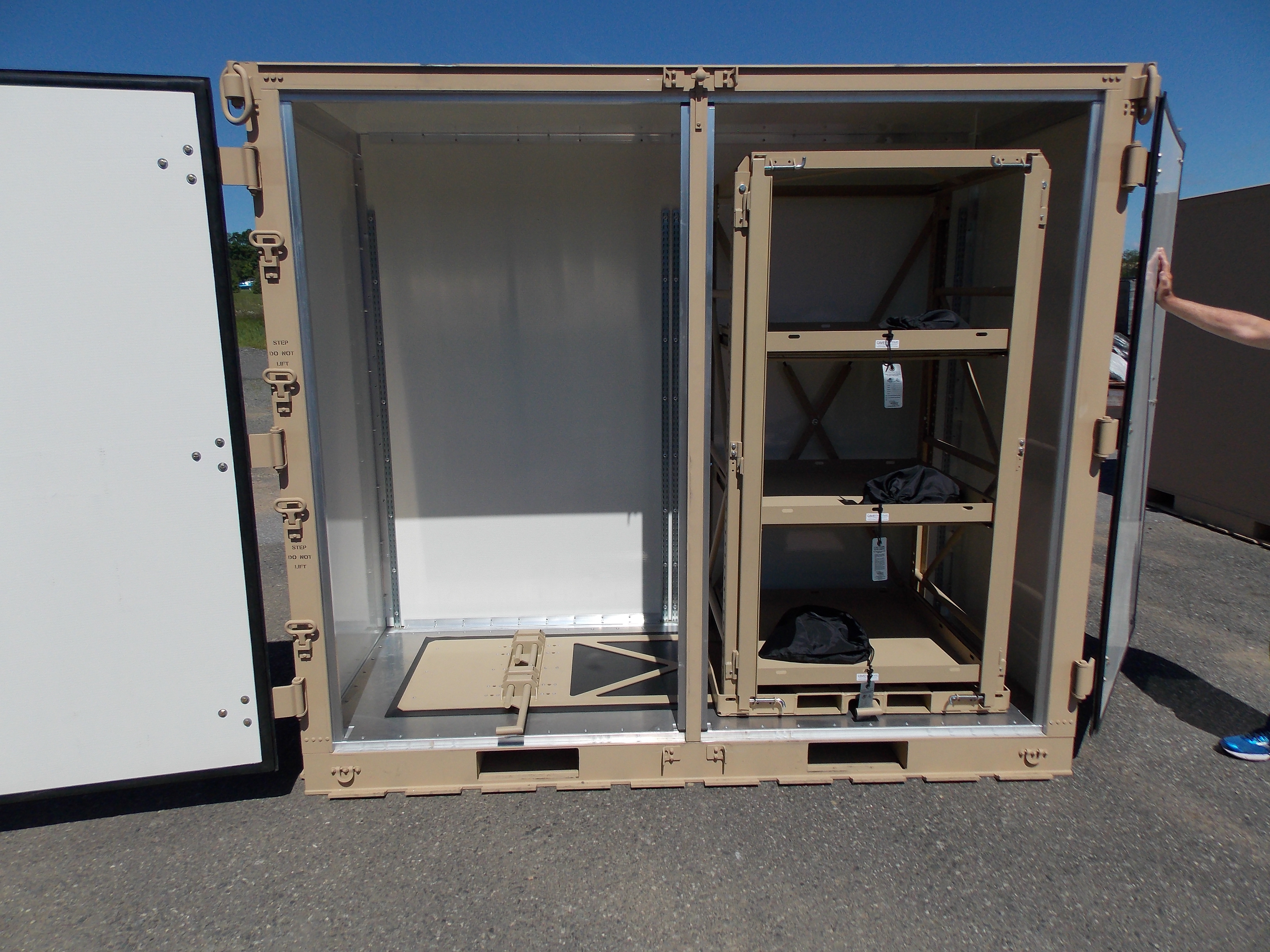The largest container we outfit with doors on both sides. Ideal for both In Garrison or Deployment with the option for PLS/LHS compatible A-Frame and rails.