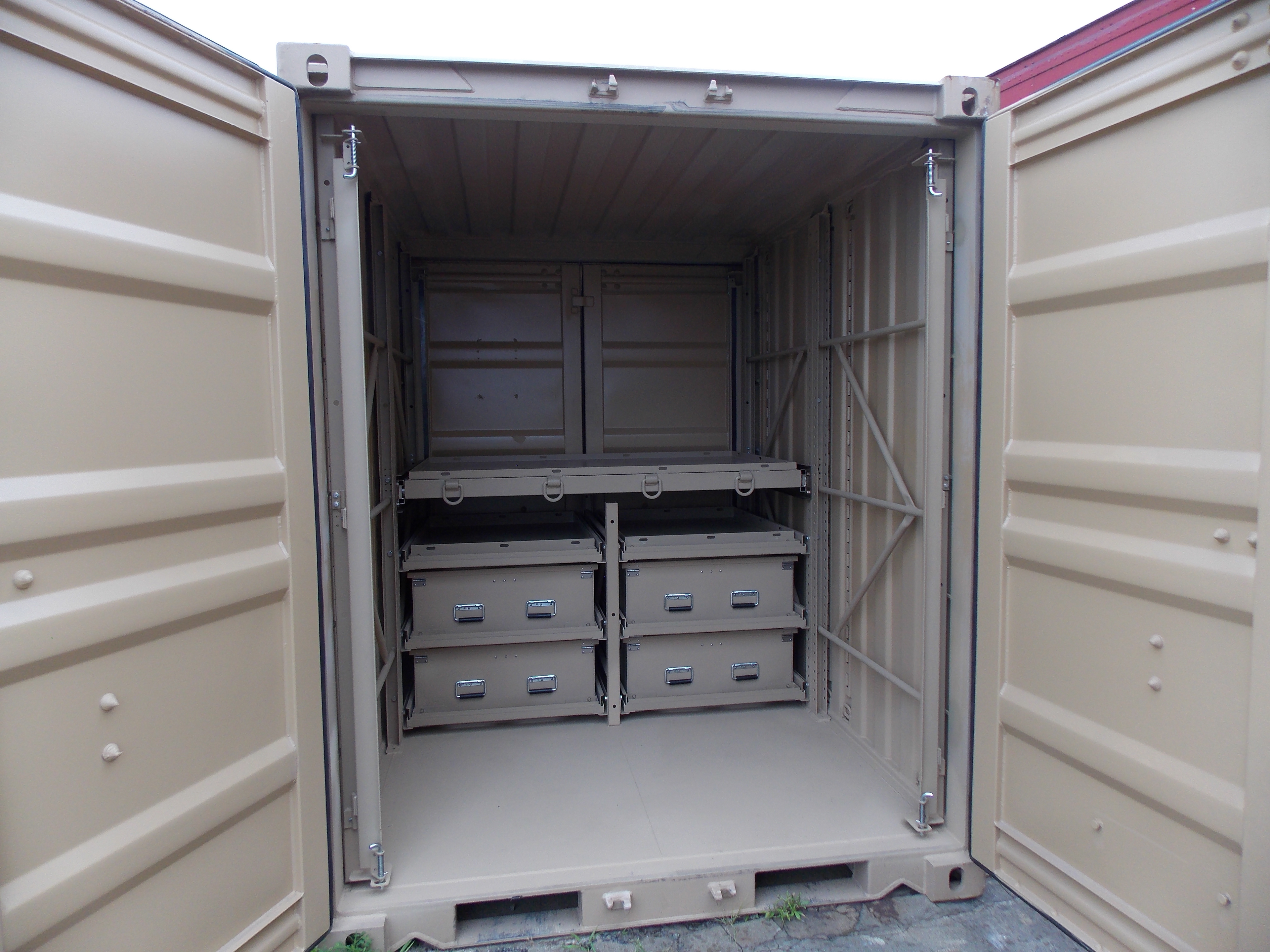 Secured into a container within minutes using a quick-release Adapter Plate. They can be used in a Warehouse function until ready for deployment and are transported easily to point of use with a forklift.