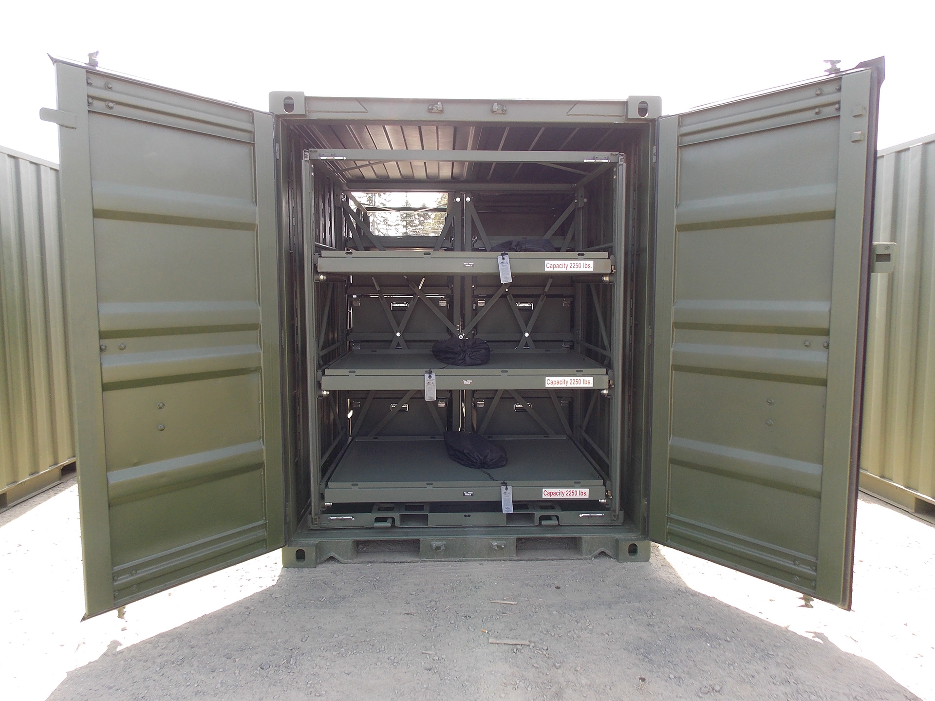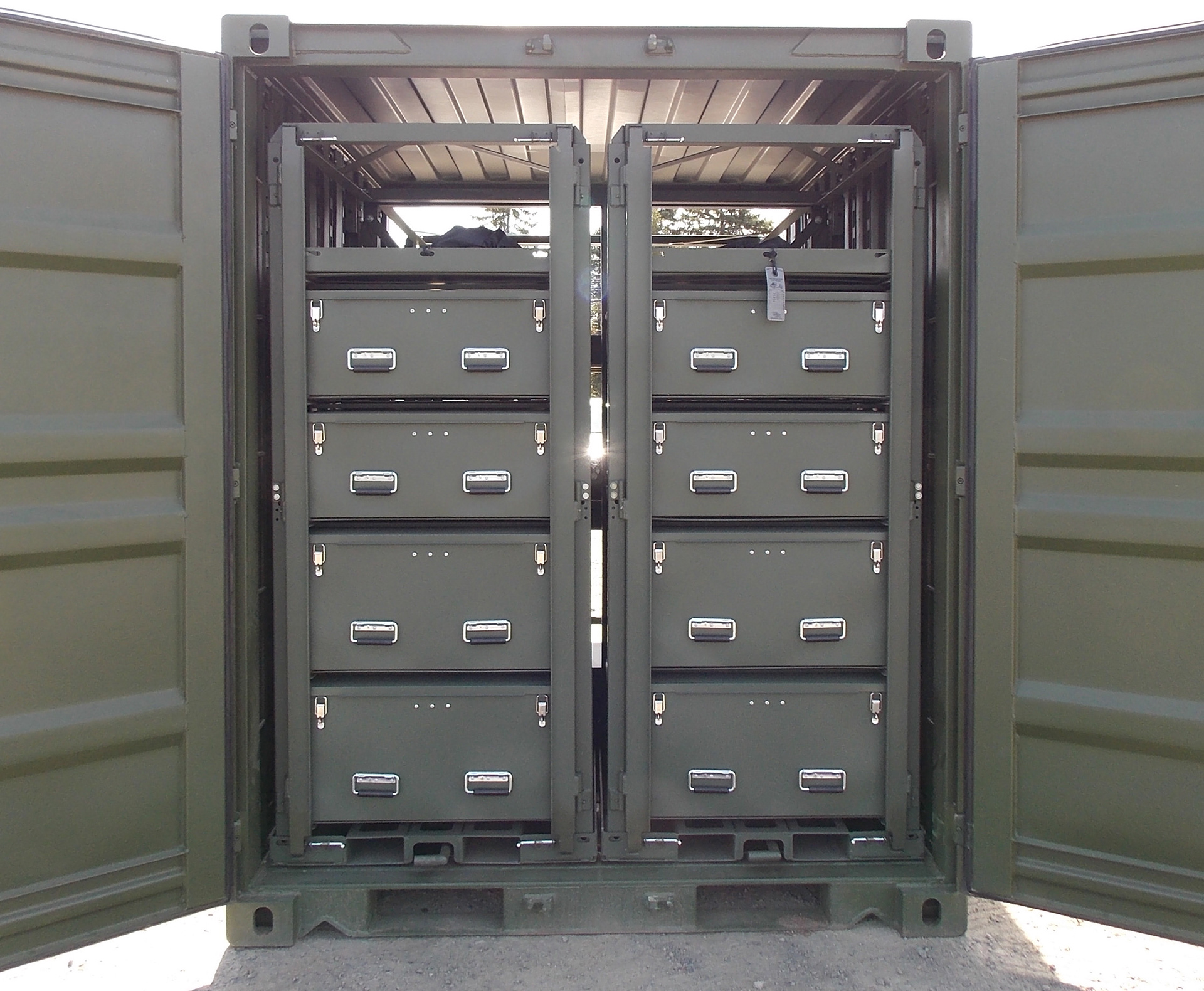 The largest container we outfit with doors on both sides. Ideal for both In Garrison or Deployment with the option for PLS/LHS compatible A-Frame and rails.